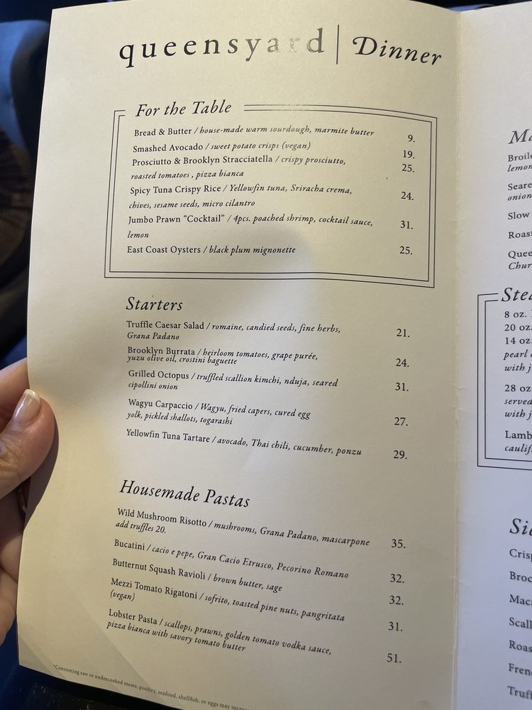 Queensyard in Hudson Yards offers a modern European - New American dining experience, with a focus on delivery, reservations, vegan options, and an upscale atmosphere. Customers rave about the savory dishes like braised baby back pork ribs, seared Atlantic salmon, and roasted half chicken, paired with well-crafted cocktails. The ambiance, highlighted by the scenic views and intimate Rose room, adds to the overall appeal. Service is praised for being fast and friendly, with knowledgeable staff. Despite some mixed reviews on pricing, the quality of food, drinks, and the overall dining experience make Queensyard a must-visit for a special night out in New York City.